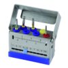 Endo Star. Support pour instruments d’endodontie, avec 3 emplacements pour des fraises turbine ou contre-angle. Equipé d’un endomètre, pour mesurer les instruments et de 2 stérimètres pour compter le nombre d’utilisations – Couvercle autobloquant – En acier inox, équipé de tubes silicone couleur pour un meilleur codage et d’un patin silicone antidérapant (amovible pour le nettoyage) – Spécial machine à laver, ultrasons et stérilisation. 5 perforations + 2 emplacements fraises. Dimensionss 5 x 2 x 5 cm.