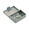 Micro-Cassette. Petite cassette spécialement étudiée pour la stérilisation en vrac des instruments rotatifs et accessoires de dentisterie; inserts de détartrage, crampons. En acier inoxydable et silicone, supporte tous les produits de décontamination et tous les modes de stérilisation jusqu’à 235°C. Peut être stérilisée sous sachet. La micro-cassette 2. Dimensions 7,4 x 6 x 2,4 cm.