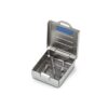 Micro-Cassette. Petite cassette spécialement étudiée pour la stérilisation en vrac des instruments rotatifs et accessoires de dentisterie; inserts de détartrage, crampons. En acier inoxydable et silicone, supporte tous les produits de décontamination et tous les modes de stérilisation jusqu’à 235°C. Peut être stérilisée sous sachet. La micro-cassette 3. Dimensions 4,2 x 5,5 x 2 cm.