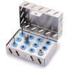Kits Implantologie N° 5 modèle T. Permettent le rangement des différents accessoires nécessaires à la pose dimplants. Trois modèles sont disponibles : – Le « modèle P » est équipé de 12 plugs en silicone pour les forets et fraises diverses. Les pans inclinés permettent une meilleure visibilité et une meilleure préhension des instruments, – Le « modèle T » est équipé de 12 tubes en silicone pour des accessoires de différents diamètres (de 2 à 6,5 mm), – Le « modèle C » est équipé de supports pour une clé à cliquet et un bassin de décontamination. Constitués d’inox et de silicone, ces kits sont conçus pour supporter tous les produits de désinfection et de décontamination, les ultrasons, les thermolaveurs et tous les modes de stérilisation. Dimensions 8 x 5,5 x 4 cm.
