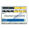 Pointes papier MultiTaper Kent Dental. Pointes papier destinées à l’obturation des canaux radiculaires préparés avec les instruments de type Protaper c’est-à-dire avec une conicité variable. Hyper-absorbantes. Séchage rapide sans pelucher. Les pointes restent fermes et flexibles même mouillées. Stériles aux rayons Gamma. Diamètre de la pointe conforme aux normes Iso. Longueur 30 mm. La boîte de 100 pointes. Marquage CE0197. Fabricant : DIADENT GROUP INTERNATIONAL.